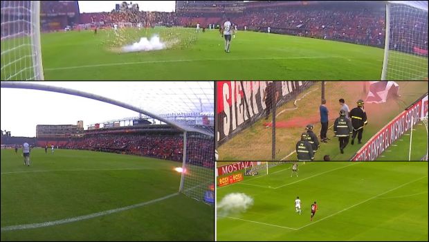Όχι το ημίχρονο, αλλά ούτε 25 λεπτά δεν πρόλαβαν να συμπληρωθούν στο Σάντα Φε και την αναμέτρηση της Κολόν με την Βέλες. Αιτία οι θερμοκέφαλοι οπαδοί των γηπεδούχων, που φαίνεται πως έβαλαν για σημάδι τον τερματοφύλακα Σέσαρ Ριγκαμόντι. Τέσσερις φορές πέταξαν αντικείμενα στον αγωνιστικό χώρο, με αποτέλεσμα ο διαιτητής να διακόψει τελικά οριστικά το παιχνίδι στο 22ο λεπτό! Όμως μπορείτε να δείτε και από το βίντεο, είναι να απορεί κανείς γιατί δεν σταμάτησε το ματς νωρίτερα, από τη στιγμή που κινδύνεψε ο παίκτης της Βέλες.