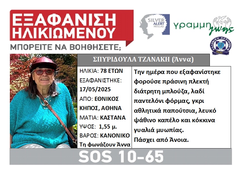 Εάν γνωρίζετε κάτι επικοινωνήστε με την υπηρεσία Silver Alert, όλο το 24ωρο, στην Εθνική Γραμμή SOS 1065.