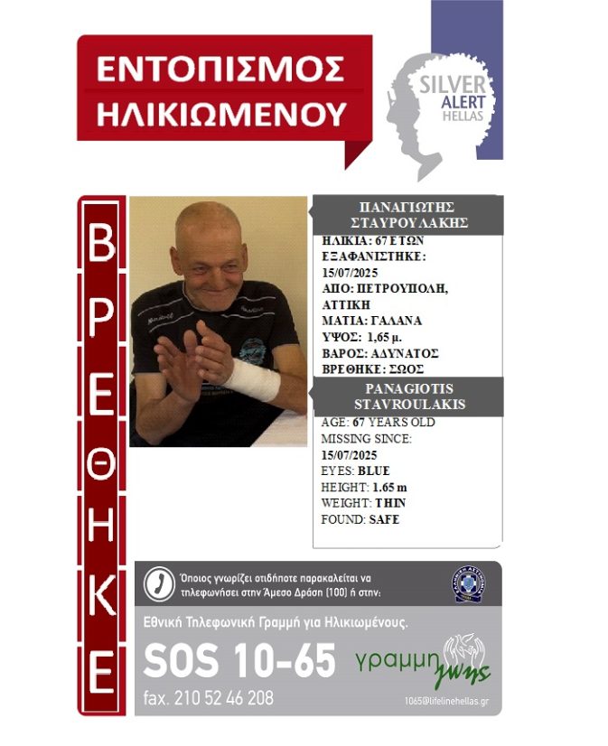 Η υπηρεσία Silver Alert, την 20/07/2025, έλαβε κλήση από ιατρό Δημόσιου Νοσοκομείου, που είχε αναγνωρίσει τον αναζητούμενο, νοσηλευόμενο στο Γ.Ν.Α Σωτηρία. Η μαρτυρία διασταυρώθηκε και ειδοποιήθηκαν οι συγγενείς, που έσπευσαν κοντά του.