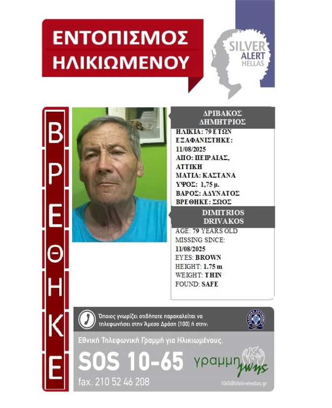 Η ΓΡΑΜΜΗ ΖΩΗΣ, ειδοποιήθηκε από τους οικείους του το μεσημέρι της 12/08/2025 και μετά τη συγκέντρωση των απαιτούμενων δικαιολογητικών, ενεργοποιίησε τον Κοινωνικό Συναγερμό SILVER ALERT, για την κινητοποίηση όλων για την ανεύρεσή του.
