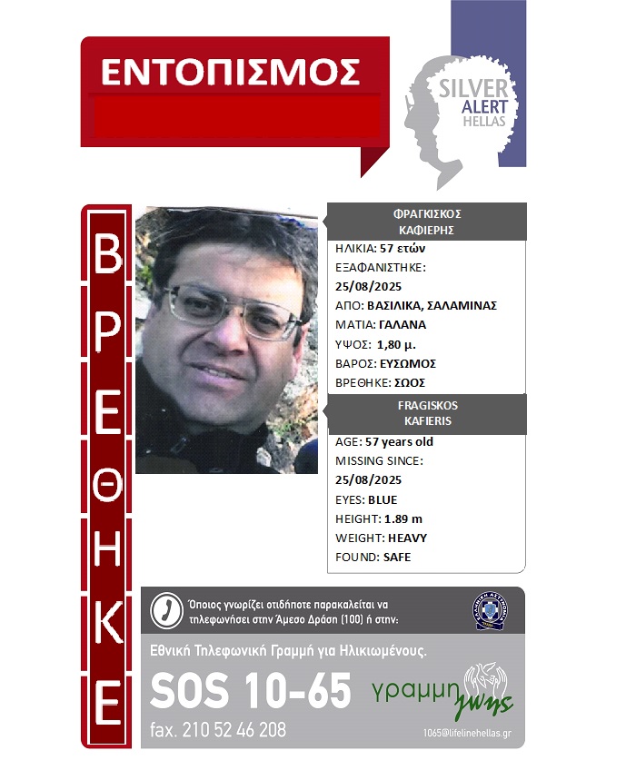 Η υπηρεσία Silver Alert, την 26/08/2025, έλαβε κλήση για την ανεύρεσή του. Ο 57χρονος, εντοπίστηκε νοσηλευόμενος σε δημόσιο νοσοκομείο, για παθολογικούς λόυους.