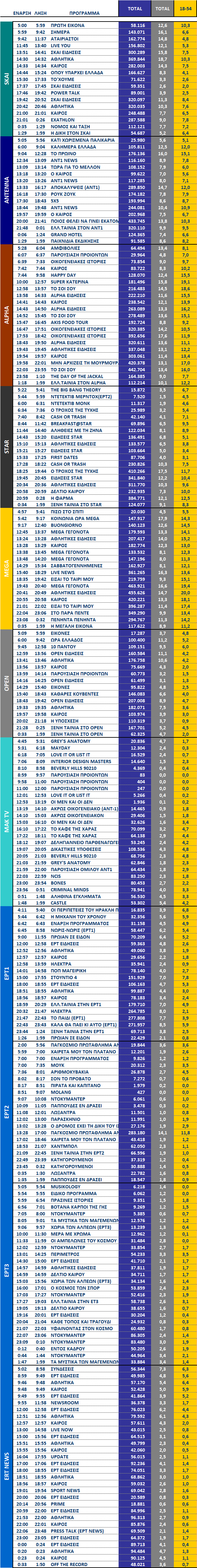 Δείτε αναλυτικά τα καθαρά νούμερα τηλεθέασης ανά ζώνη – πρωινή, μεσημεριανή, απογευματινή και βραδινή – και ποιοι βρέθηκαν στην κορυφή της νέας σεζόν.