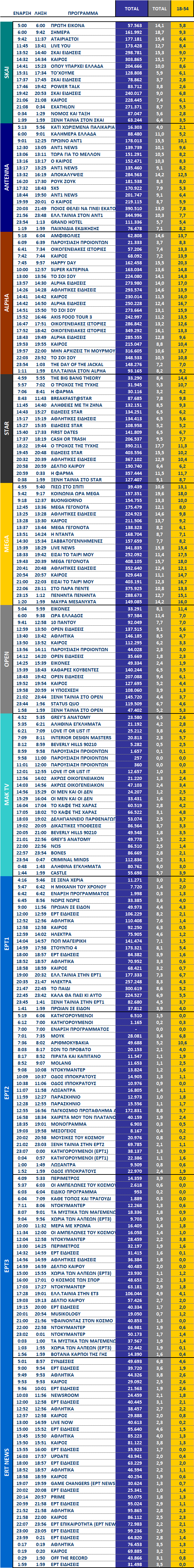 Δείτε αναλυτικά τα καθαρά νούμερα τηλεθέασης ανά ζώνη – πρωινή, μεσημεριανή, απογευματινή και βραδινή – και ποιοι βρέθηκαν στην κορυφή της νέας σεζόν.