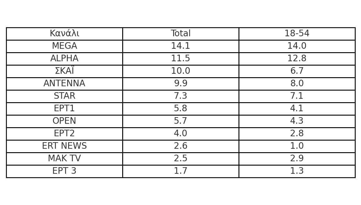 Πώς διαμορφώθηκαν χθες οι μέσοι όροι τηλεθέασης των καναλιών εθνικής εμβέλειας στο σύνολο ημέρας;