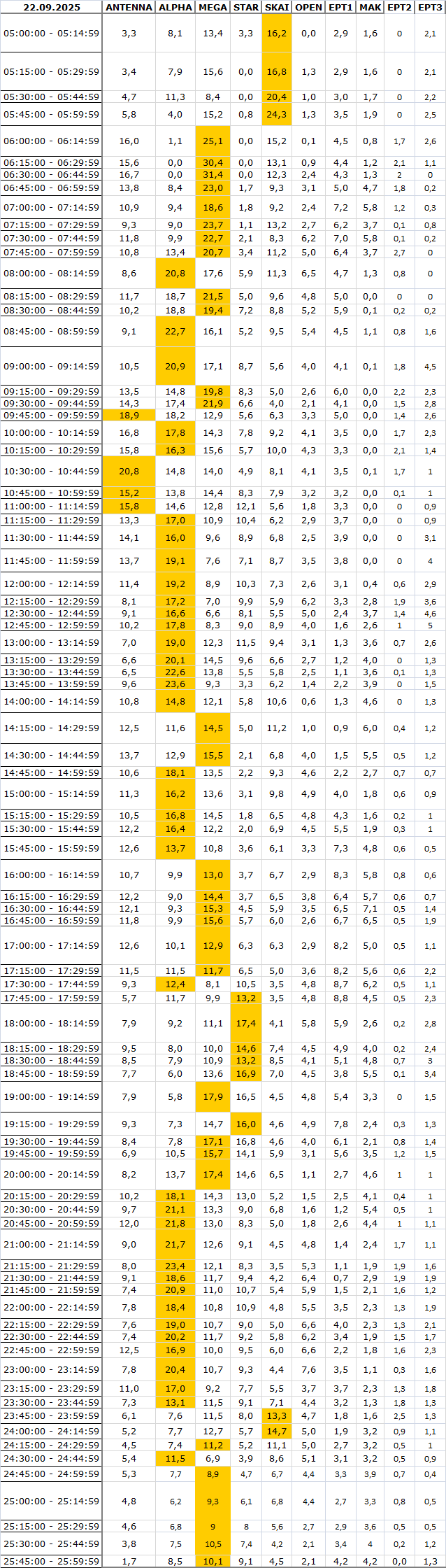 Δείτε αναλυτικά μέσα απο το TVNEA.COM τα 15' στο δυναμικό κοινό αλλα και το σύνολο ημέρα και prime time.