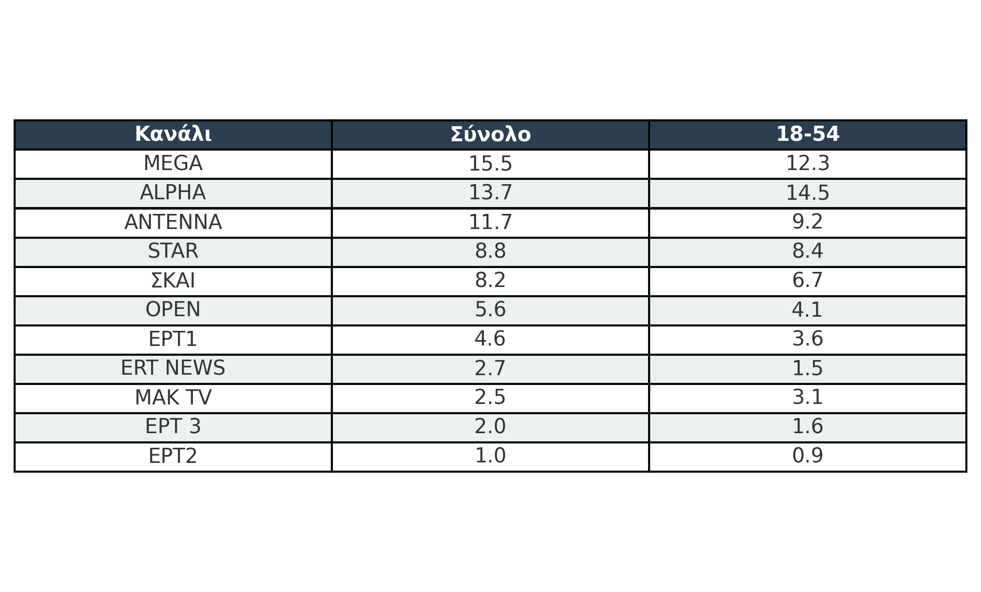 Πώς διαμορφώθηκαν χθες οι μέσοι όροι τηλεθέασης των καναλιών εθνικής εμβέλειας στο σύνολο ημέρας;