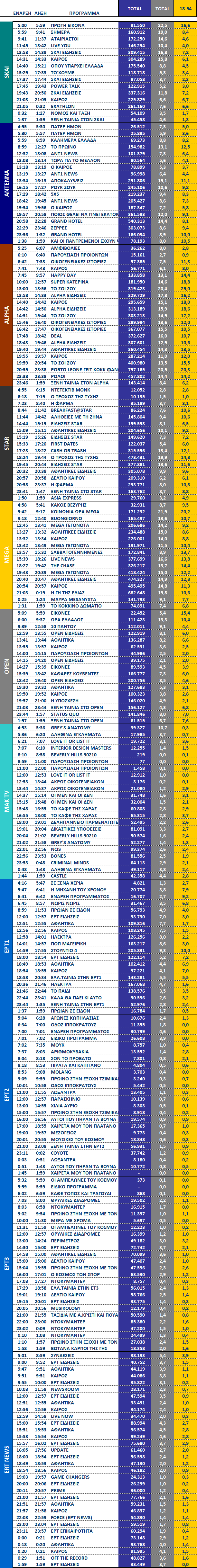 Δείτε αναλυτικά τα καθαρά νούμερα τηλεθέασης ανά ζώνη – πρωινή, μεσημεριανή, απογευματινή και βραδινή – και ποιοι βρέθηκαν στην κορυφή της νέας σεζόν.
