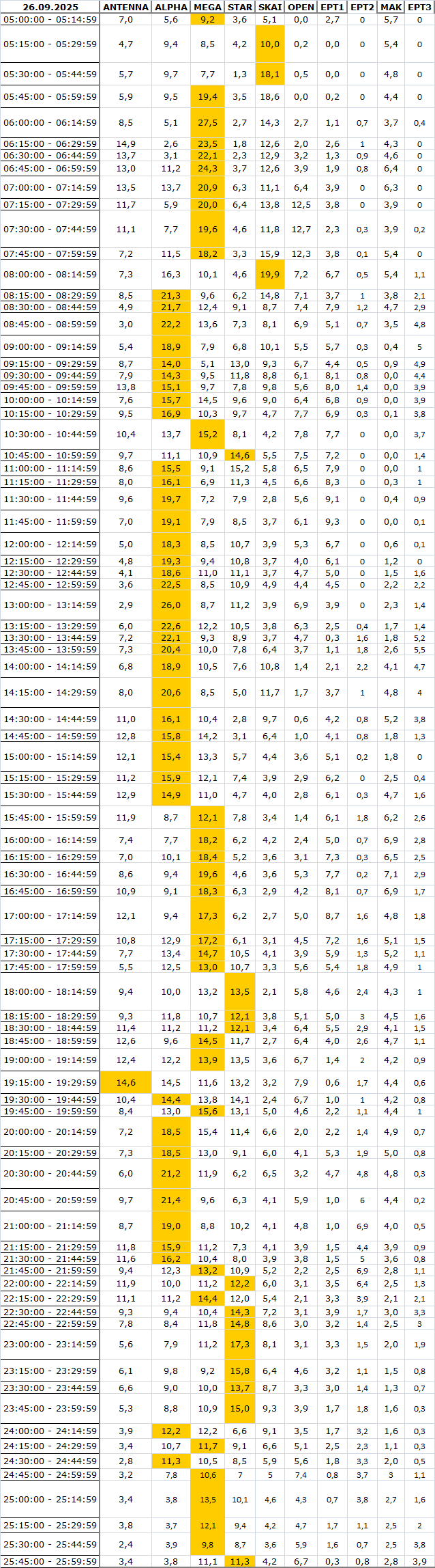 Δείτε αναλυτικά μέσα απο το TVNEA.COM τα 15' στο δυναμικό κοινό αλλα και το σύνολο ημέρα και prime time.