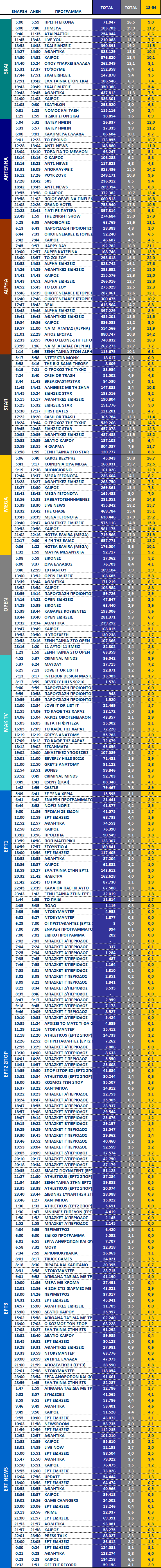 Δείτε αναλυτικά τα καθαρά νούμερα τηλεθέασης ανά ζώνη – πρωινή, μεσημεριανή, απογευματινή και βραδινή – και ποιοι βρέθηκαν στην κορυφή της νέας σεζόν.