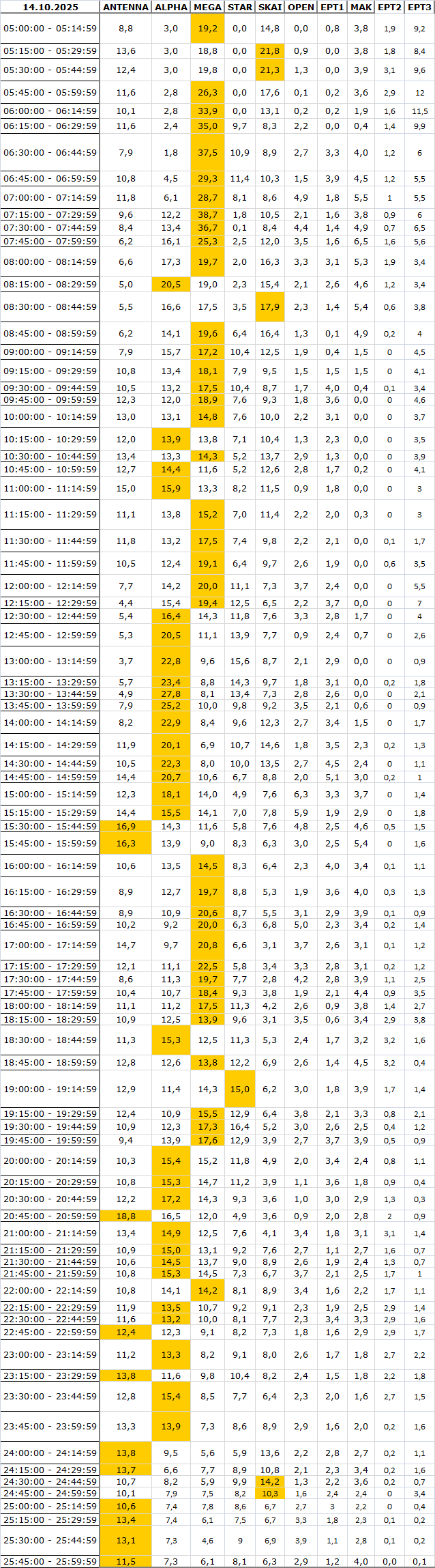 Δείτε αναλυτικά μέσα απο το TVNEA.COM τα 15' στο δυναμικό κοινό αλλα και το σύνολο ημέρα και prime time.