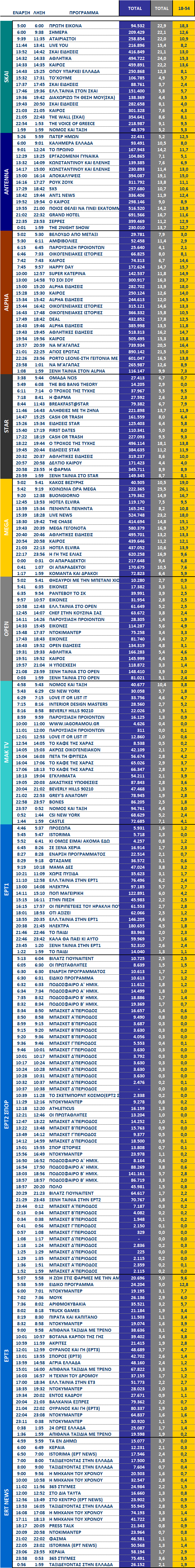 Δείτε αναλυτικά τα καθαρά νούμερα τηλεθέασης ανά ζώνη – πρωινή, μεσημεριανή, απογευματινή και βραδινή – και ποιοι βρέθηκαν στην κορυφή της νέας σεζόν.
