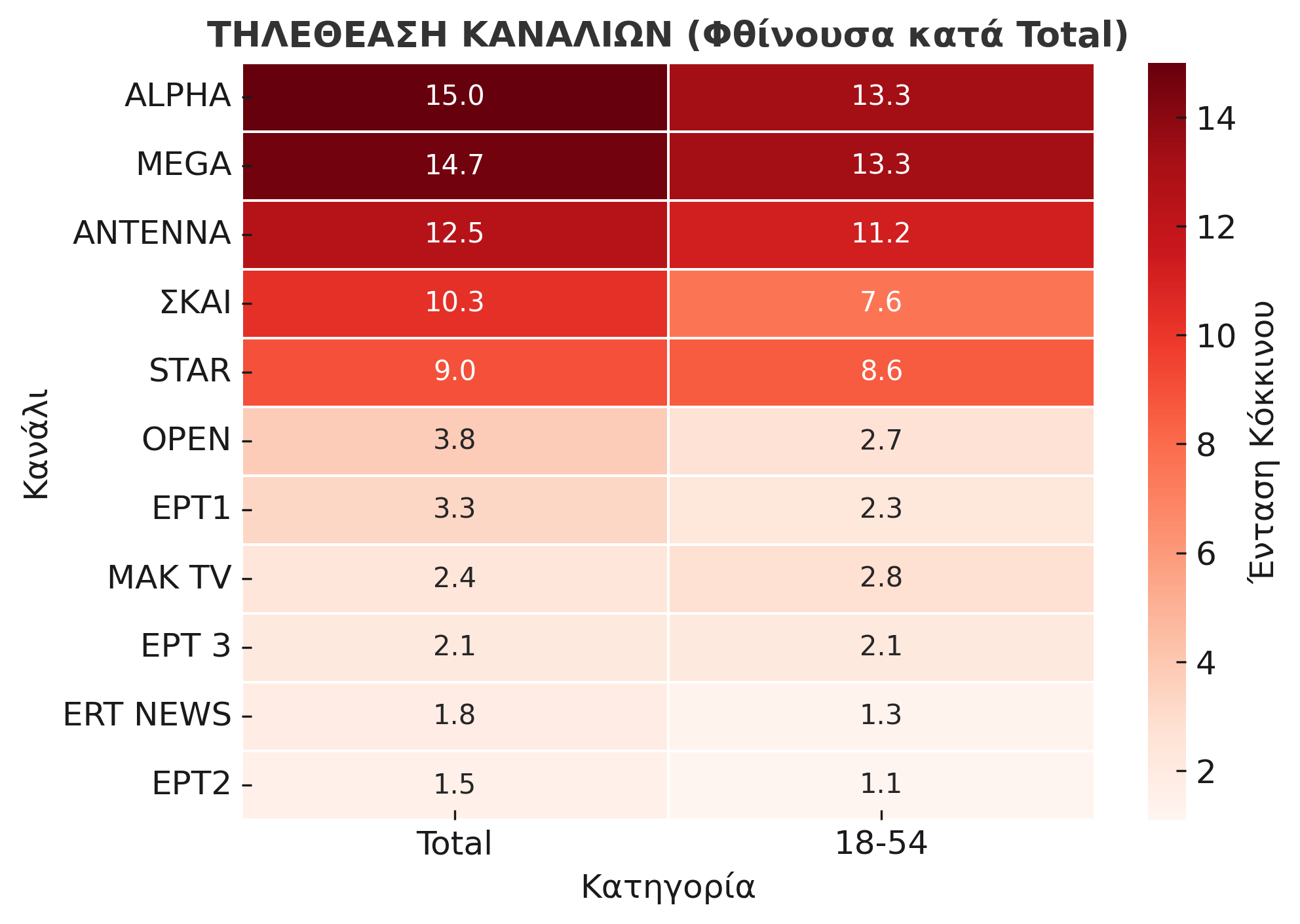 Στην αποτύπωση αυτή περιλαμβάνονται τα ποσοστά τόσο στο σύνολο κοινού, που καταγράφει τη γενική εικόνα της απήχησης, όσο και στο δυναμικό κοινό, το οποίο αποτελεί τον πιο εμπορικό δείκτη για τους σταθμούς και συγκεντρώνει ιδιαίτερο ενδιαφέρον.