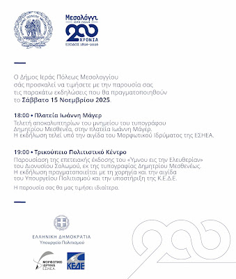 Ο Δήμος Ιερής Πόλης Μεσολογγίου διοργανώνει το Σάββατο, 15 Νοεμβρίου 2025, δύο σημαντικές εκδηλώσεις, στο Μνημείο Δημητρίου Μεσθενέα και στο Τρικούπειο Πολιτιστικό Κέντρο, αφιερωμένες στην ιστορία του Ελληνικού Τύπου και στην πνευματική κληρονομιά της Εξόδου, στο πλαίσιο της προετοιμασίας των τιμητικών εκδηλώσεων για τη Διακοσιοστή Επέτειο της Εξόδου του Μεσολογγίου.....Διαβάστε Περισσότερα... ximeronews