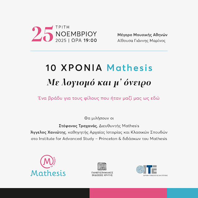 Με μεγάλη μας χαρά σάς προσκαλούμε στα γενέθλια των δέκα χρόνων του Mathesis στην Αθήνα. Στην βραδιά αυτή θα έχουμε τη χαρά να ευχαριστήσουμε δημόσια τους φίλους και τα μέλη της οικογένειας του Mathesis: διδάσκουσες και διδάσκοντες, εθελόντριες και εθελοντές, φορείς, οργανισμούς, επιχειρήσεις και ανθρώπους που ενίσχυσαν οικονομικά και ηθικά την προσπάθειά μας και βεβαίως τις φοιτήτριες και τους φοιτητές της κοινότητάς μας. Με λίγα λόγια, όλους εσάς που μας συντροφεύσατε στην πρώτη δεκαετία μας και μας δείξατε αυτή «την άλλη Ελλάδα» που βρίσκεται εκεί έξω!