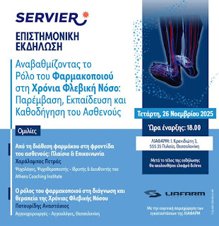Την Τετάρτη 26 Νοεμβρίου σας περιμένουμε στις εγκαταστάσεις μας, που θα πραγματοποιηθεί το νέο εκπαιδευτικό μας σεμινάριο σε συνεργασία με τη Servier, με θέμα «Αναβαθμίζοντας τον Ρόλο του Φαρμακοποιού στη Χρόνια Φλεβική Νόσο».