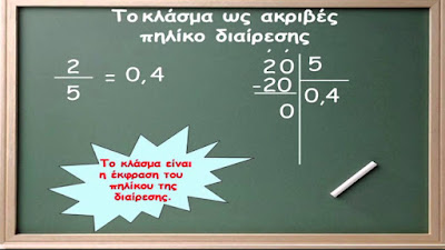 Όπως γνωρίζουμε από την περσινή χρονιά, το κλάσμα φανερώνει μια διαίρεση, του αριθμητή δια τον παρονομαστή. Με αυτό τον τρόπο μετατρέπουμε τα κλάσματα σε δεκαδικούς ή φυσικούς αριθμούς. Κάντε "Κλικ στη μάθηση" παρακάτω για να προβάλετε το εκπαιδευτικό υλικό του 20ου κεφαλαίου "Το κλάσμα ως ακριβές πηλίκο μια διαίρεσης" Κλασματικοί αριθμοί (Θ. Αρβανιτίδης)