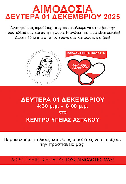 ΑΥΤΗ ΤΗ ΦΟΡΑ Η ΑΙΜΟΔΟΣΙΑ ΘΑ ΠΡΑΓΜΑΤΟΠΟΙΗΘΕΊ ΣΤΟ ΚΕΝΤΡΟ ΥΓΕΙΑΣ ΑΣΤΑΚΟΥ.