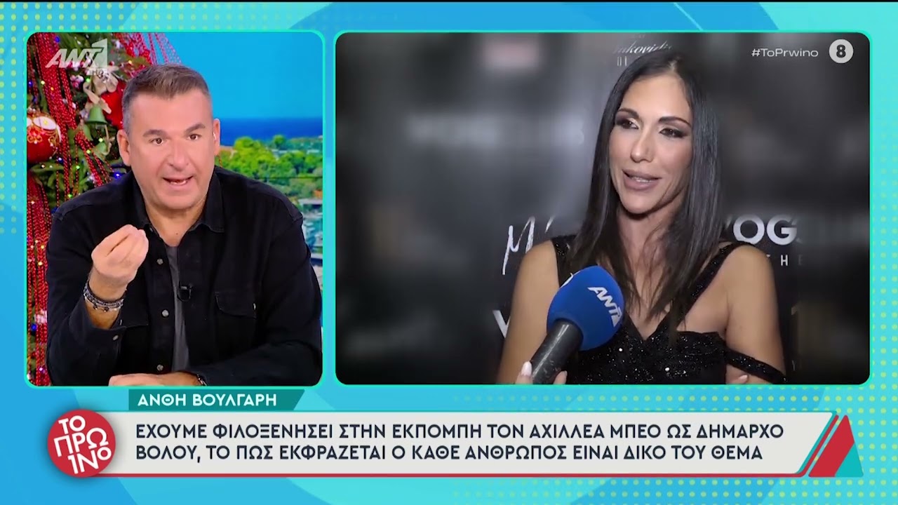 «Δε μου αρέσουν αυτού του είδους οι εκφράσεις. Όμως επειδή είμαι από τον Βόλο, ξέρω ότι ο κ. Μπέος με τον κ. Πολύζο έχουν φιλική σχέση. Δε ξέρω αν είναι και ένας δικός τους κώδικα επικοινωνίας. Εμένα δεν με βρίσκει σύμφωνη. Δε θα σου πω ότι μου άρεσε αυτό που άκουσα και είδα. Έχουμε φιλοξενήσει ως Δήμαρχο Βόλου στην εκπομπή. Από εκεί και πέρα το πώς εκφράζεται ο κάθε άνθρωπος είναι δικό του θέμα αλλά αυτό δε σημαίνει ότι πρέπει να συμφωνούμε όλοι» είπε χαρακτηριστικά η Ανθή Βούλγαρη.