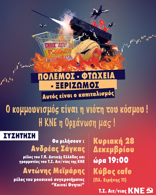 Η ΤΟ Αιτωλοακαρνανίας της ΚΝΕ διοργανώνει εκδήλωση - συζήτηση με θέμα «Πόλεμος - φτώχεια - ξεριζωμός, αυτός είναι ο καπιταλισμός! - Ο κομμουνισμός είναι η νιότη του κόσμου! - Η ΚΝΕ η Οργάνωσή μας!» την Κυριακή 28 Δεκέμβρη, στις 7 μ.μ., στο «Κύβος cafe» στο Αγρίνιο (πλατεία Ειρήνης 11). ...Διαβάστε Περισσότερα... ximeronews