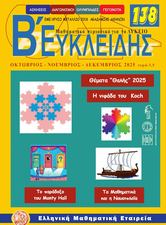 Μια από τις πιο ενδιαφέρουσες χτεσινές ειδήσεις του ΑΠΕ-ΜΠΕ αναφέρεται στην κυκλοφορία του τεύχους Δεκεμβρίου του περιοδικού «Ευκλείδης Β’», της Ελληνικής Μαθηματικής Εταιρείας (ΕΜΕ). Στην ύλη του περιοδικού περιλαμβάνονται, μεταξύ άλλων: «Θέματα «Θαλής» 2025», «Η νιφάδα του Koch», «Το παράδοξο του Monty Hall», «Τα Μαθηματικά και η Ναυσιπλοΐα» κά.