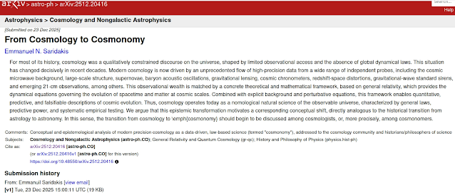 . Ο παρατηρησιακός αυτός πλούτος συνοδεύεται από ένα σαφώς διατυπωμένο θεωρητικό και μαθηματικό πλαίσιο, βασισμένο στη γενική σχετικότητα, το οποίο παρέχει τις δυναμικές εξισώσεις που διέπουν την εξέλιξη του χωροχρόνου και της ύλης σε κοσμικές κλίμακες. Σε συνδυασμό με ρητά διατυπωμένες εξισώσεις υποβάθρου και διαταραχών, το πλαίσιο αυτό καθιστά δυνατές ποσοτικές, προβλεπόμενες και διαψεύσιμες περιγραφές της κοσμικής εξέλιξης. Η κοσμολογία λειτουργεί πλέον ως νομολογική φυσική επιστήμη του παρατηρήσιμου σύμπαντος, η οποία χαρακτηρίζεται από τη διατύπωση γενικών νόμων, προβλέψιμη ισχύ και συστηματικό εμπειρικό έλεγχο. Υποστηρίζουμε ότι αυτή η επιστημολογική μεταμόρφωση καθιστά αναγκαία μια αντίστοιχη εννοιολογική μετατόπιση, άμεσα ανάλογη με την ιστορική μετάβαση από την αστρολογία στην αστρονομία. Υπό αυτή την έννοια, η μετάβαση από την κοσμολογία στην κοσμονομία θα πρέπει να αρχίσει να τίθεται προς συζήτηση μεταξύ των κοσμολόγων. ή, ακριβέστερα, μεταξύ των κοσμονόμων.”