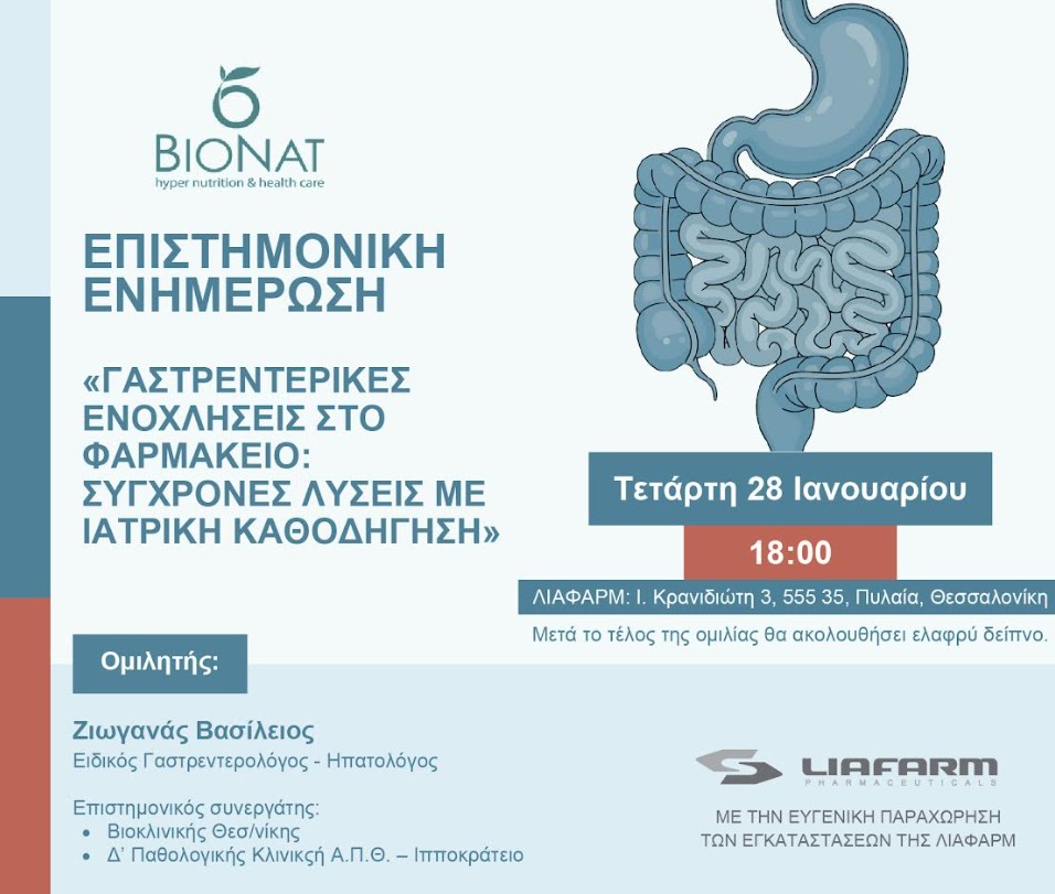 Η Liafarm, σε συνεργασία με τη Bionat, διοργανώνει την Τετάρτη 28 Ιανουαρίου το εκπαιδευτικό σεμινάριο με θέμα “Γαστρεντερικές Ενοχλήσεις στο Φαρμακείο: Σύγχρονες Λύσεις με Ιατρική Καθοδήγηση”