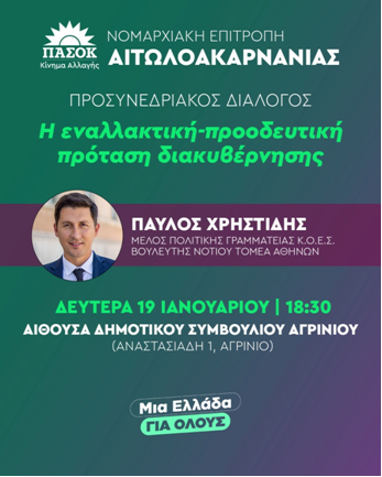Σας καλούμε στον προσυνεδριακό διάλογο, την Δευτέρα 19 Ιανουαρίου 2026 και ώρα 18:30, στην αίθουσα του Δημοτικού Συμβουλίου Αγρινίου (οδός Αναστασιάδη 1).