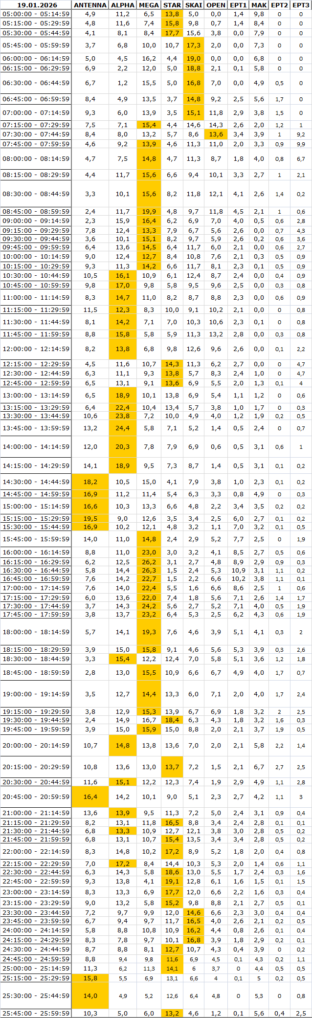 Δείτε αναλυτικά μέσα απο το TVNEA.COM τα 15' στο δυναμικό κοινό αλλα και το σύνολο ημέρα και prime time.