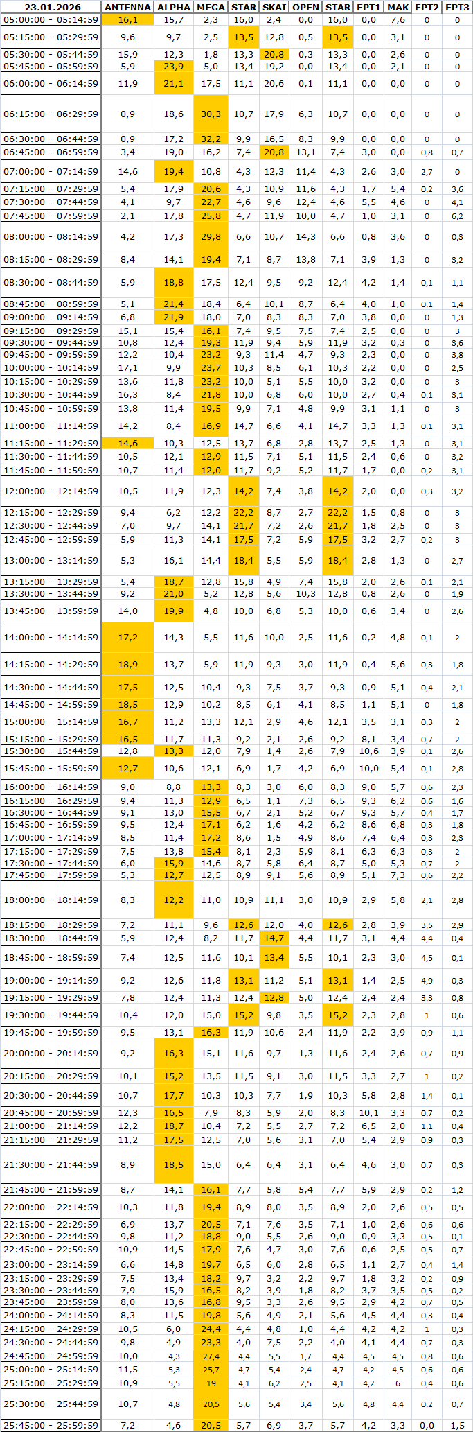 Δείτε αναλυτικά μέσα απο το TVNEA.COM τα 15' στο δυναμικό κοινό αλλα και το σύνολο ημέρα και prime time.