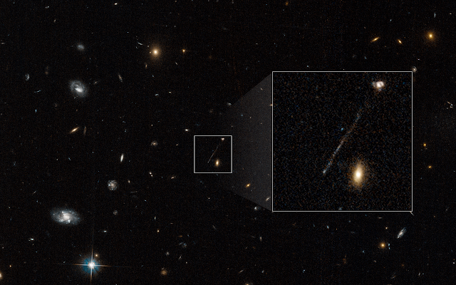 Φωτογραφία: Αυτή η εικόνα από το φωτογραφικό αρχείο του διαστημικού τηλεσκοπίου Hubble αποτυπώνει μια παράξενη γραμμική δομή μήκους 200.000 ετών φωτός. Μετέπειτα παρατηρήσεις αποκάλυψαν ότι η δομή αυτή αποτελείται από νεογέννητα μπλε άστρα. Η υπερμεγέθης μαύρη τρύπα βρίσκεται στην άκρη αυτής της δομής, κάτω και αριστερά, και εκτινάχθηκε από τον γαλαξία της που βρίσκεται στην επάνω δεξιά γωνία [Credit: NASA, ESA, Pieter van Dokkum (Yale); Image Processing: Joseph DePasquale (STScI)].