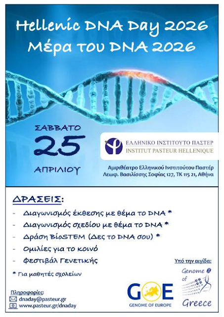 Σας ενημερώνουμε ότι το Ελληνικό Ινστιτούτο Παστέρ στο πλαίσιο της Ελληνικήs Εθνικήs Ημέραs DNA διοργανώνει διαγωνισμό έκθεσης και σχεδίου με θέμα το DNA που απευθύνεται σε μαθητές Γυμνασίου και Λυκείου ηλικίας 12-17 ετών. Για τους όρους του διαγωνισμού δείτε την ιστοσελίδα https://www.pasteur.gr/el/dnaday. Ημερομηνία έναρξης διαγωνισμού 25 Iανουαρίου 2026 και λήξης 26 Μαρτίου 2026.