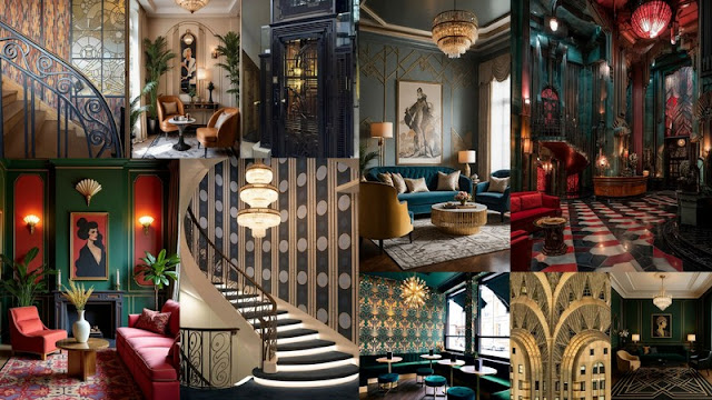 ζιγκ-ζαγκ και ακτινωτά μοτίβα επανάληψη γεωμετρικών σχημάτων ισχυρές κάθετες γραμμές έμφαση στην επιφάνεια και τη στιλπνότηταΤα υλικά παίζουν καθοριστικό ρόλο: λάκες, εξωτικά ξύλα, μάρμαρο, χρώμιο, ανοξείδωτο ατσάλι και γυαλί χρησιμοποιούνται όχι μόνο για τη λειτουργικότητά τους, αλλά και ως σύμβολα εκσυγχρονισμού και πολυτέλειας.