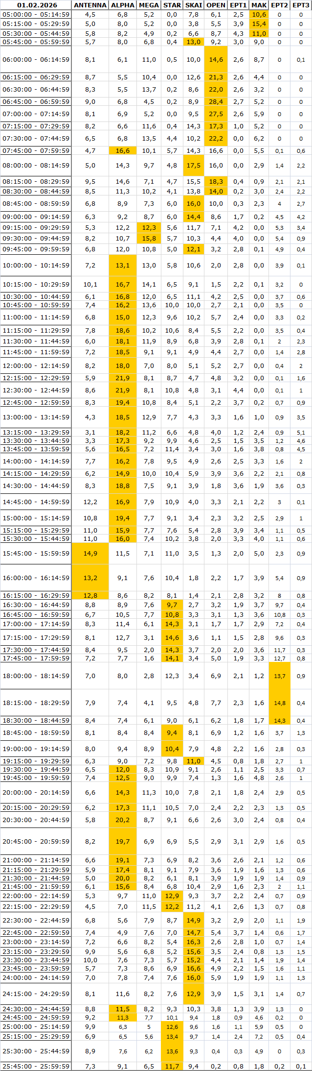 Νούμερα τηλεθέασης στα προγράμματα ανα ζώνη (1/2/2026)