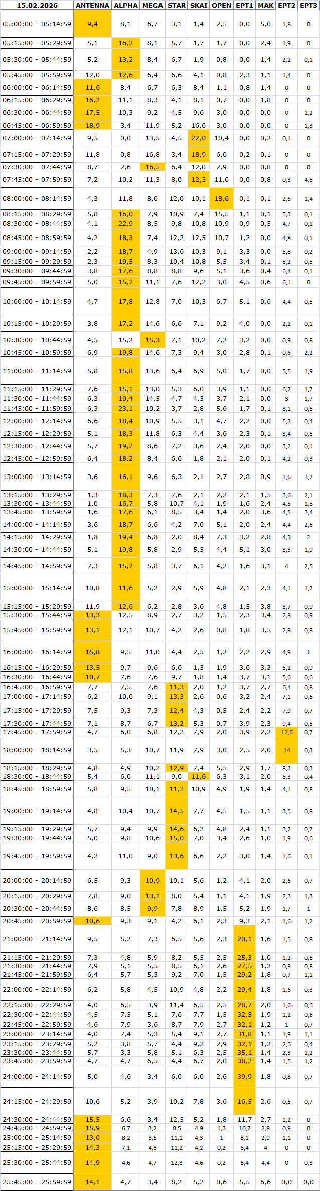 Δείτε αναλυτικά μέσα απο το TVNEA.COM τα 15' στο δυναμικό κοινό αλλα και το σύνολο ημέρα και prime time.