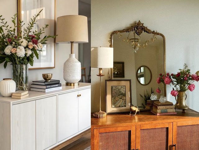 Σε έναν μπουφέ ή έπιπλα με παρόμοια μορφή, όπου η επιφάνεια είναι συνήθως μεγαλύτερη, η διαφοροποίηση ύψους αλλάζει ακόμη περισσότερο τη γενική εικόνα. Ένα φωτιστικό, ένα ψηλό βάζο ή ένα φυτό μπορούν να αποτελέσουν το πιο έντονο στοιχείο της σύνθεσης. Δίπλα τους μπορεί να τοποθετηθεί μια κορνίζα, ένα μικρότερο κεραμικό, γυάλινο ή μεταλλικό αντικείμενο ή μερικά βιβλία, ώστε να δημιουργηθεί μια πιο φυσική κλιμάκωση.