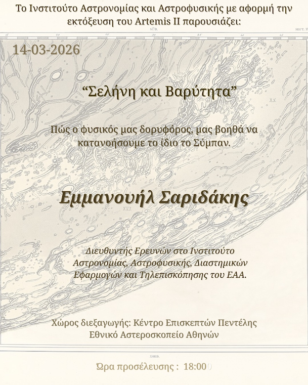 Το Σάββατο 14/3 ο Δρ. Μάνος Σαριδάκης, Δ/ντης ερευνών του ΕΑΑ, θα μας μιλήσει για το πως ο φυσικός μας δορυφόρος μας βοηθά να κατανοήσουμε το σύμπαν.