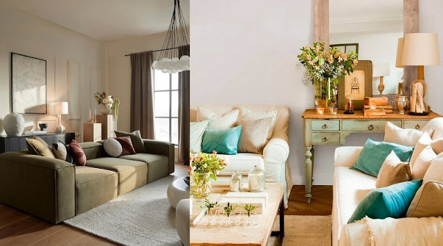 Αντίθετα, σε πιο μικρά σαλόνια - καθιστικά δύο καναπέδες, στο κατάλληλο μέγεθος, μοιράζουν το οπτικό βάρος. Δημιουργούν συμμετρία και σε διαγώνια σύνθεση αφήνουν περισσότερο «αέρα» ανάμεσά τους, οργανώνουν αποτελεσματικότερα τον κεντρικό άξονα του σαλονιού και διευκολύνουν την συνομιλία.