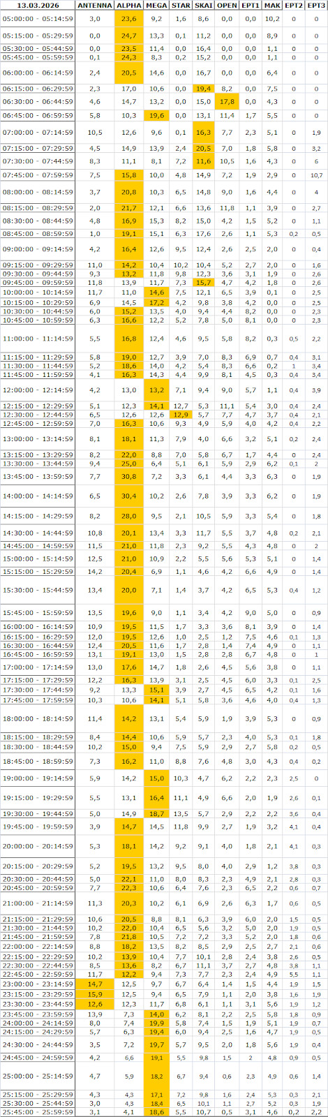 Δείτε αναλυτικά μέσα απο το TVNEA.COM τα 15' στο δυναμικό κοινό αλλα και το σύνολο ημέρα και prime time.