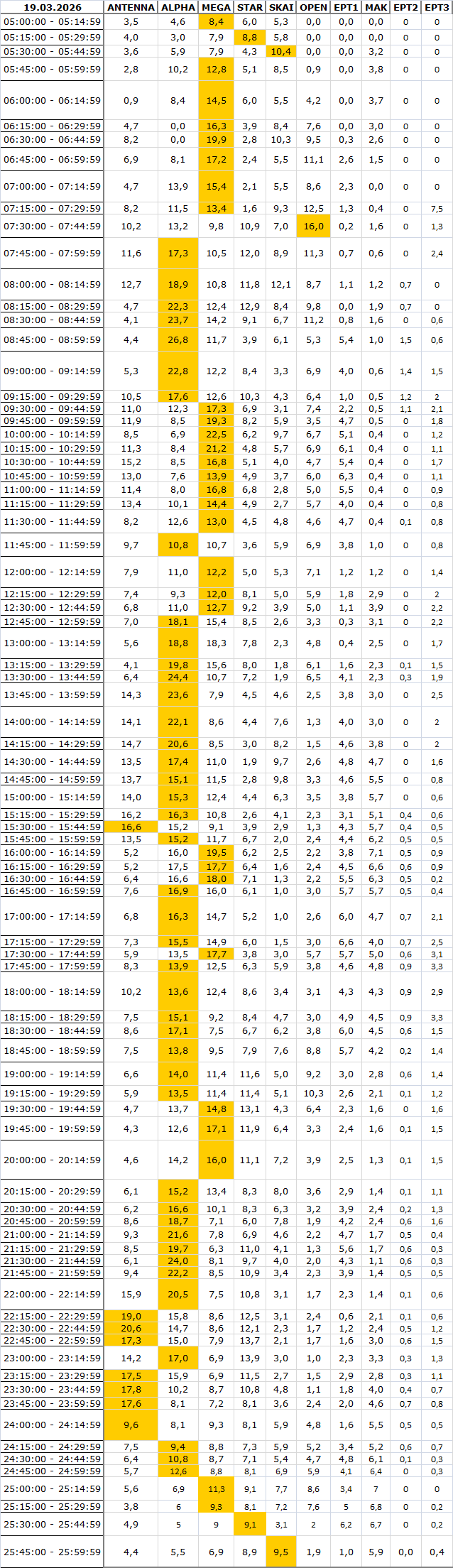 Δείτε αναλυτικά μέσα απο το TVNEA.COM τα 15' στο δυναμικό κοινό αλλα και το σύνολο ημέρα και prime time.