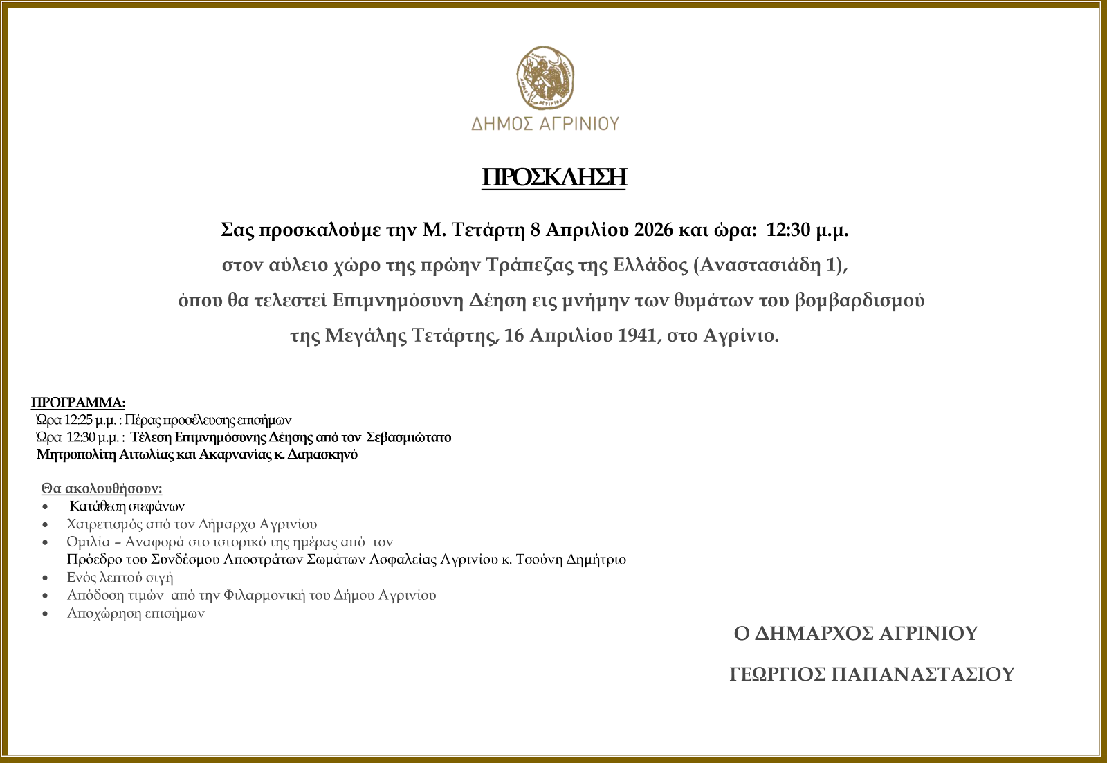 Ο Δήμος Αγρινίου τιμά τη μνήμη των θυμάτων του βομβαρδισμού της πόλης κατά τη διάρκεια του Β’ Παγκοσμίου Πολέμου και διοργανώνει επιμνημόσυνη δέηση την Μεγάλη Τετάρτη 8 Απριλίου 2026 και ώρα 12:30 μ.μ., στον αύλειο χώρο της πρώην Τράπεζας της Ελλάδος (Αναστασιάδη 1).....Διαβάστε Περισσότερα... ximeronews