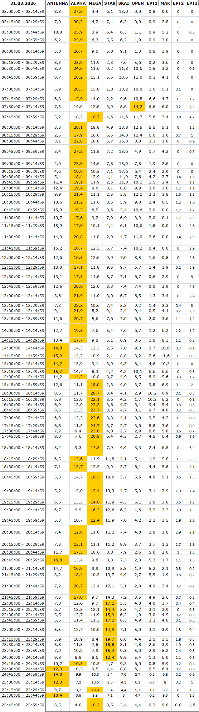 Δείτε αναλυτικά μέσα απο το TVNEA.COM τα 15' στο δυναμικό κοινό αλλα και το σύνολο ημέρα και prime time.