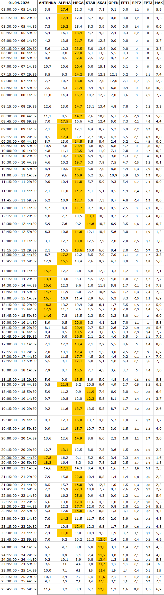 Δείτε αναλυτικά μέσα απο το TVNEA.COM τα 15' στο δυναμικό κοινό αλλα και το σύνολο ημέρα και prime time.