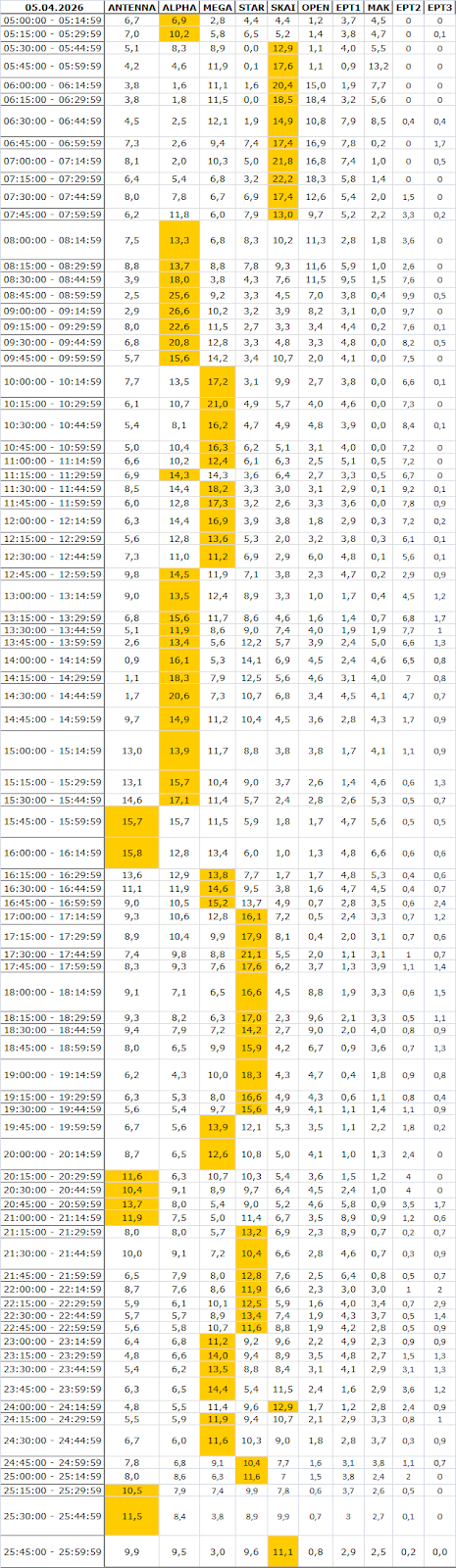 Δείτε αναλυτικά μέσα απο το TVNEA.COM τα 15' στο δυναμικό κοινό αλλα και το σύνολο ημέρα και prime time.