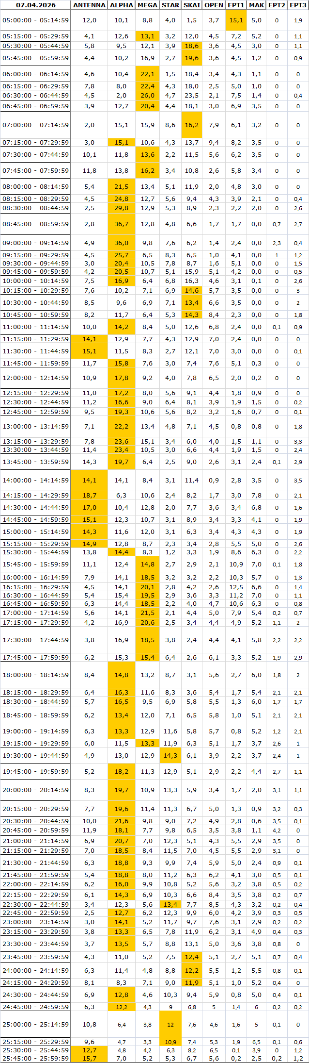 Δείτε αναλυτικά μέσα απο το TVNEA.COM τα 15' στο δυναμικό κοινό αλλα και το σύνολο ημέρα και prime time.