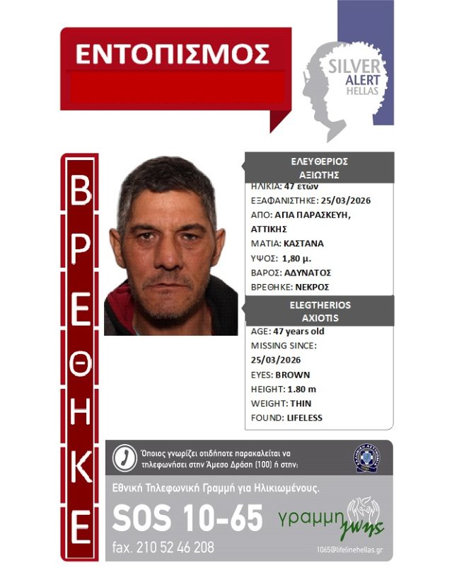 Η υπηρεσία Silver Alert, την 09/04/2026, δέχθηκε κλήση για τον εντοπισμό και την απώλεια ζωής του. Ο 47χρονος, είχε εντοπιστεί την 27/03/2026 από πολίτη στις Αχαρνές Αττικής, χωρίς τις αισθήσεις του. Στο σημείο μετέβησαν περιπολικό της ΕΛ.ΑΣ. και πλήρωμα του ΕΚΑΒ, οπότε και διαπιστώθηκε ότι ο άνδρας είχε καταλήξει. Όπως προέκυψε στη συνέχεια, επρόκειτο για τον αναζητούμενο Ελευθέριο Αξιώτη.