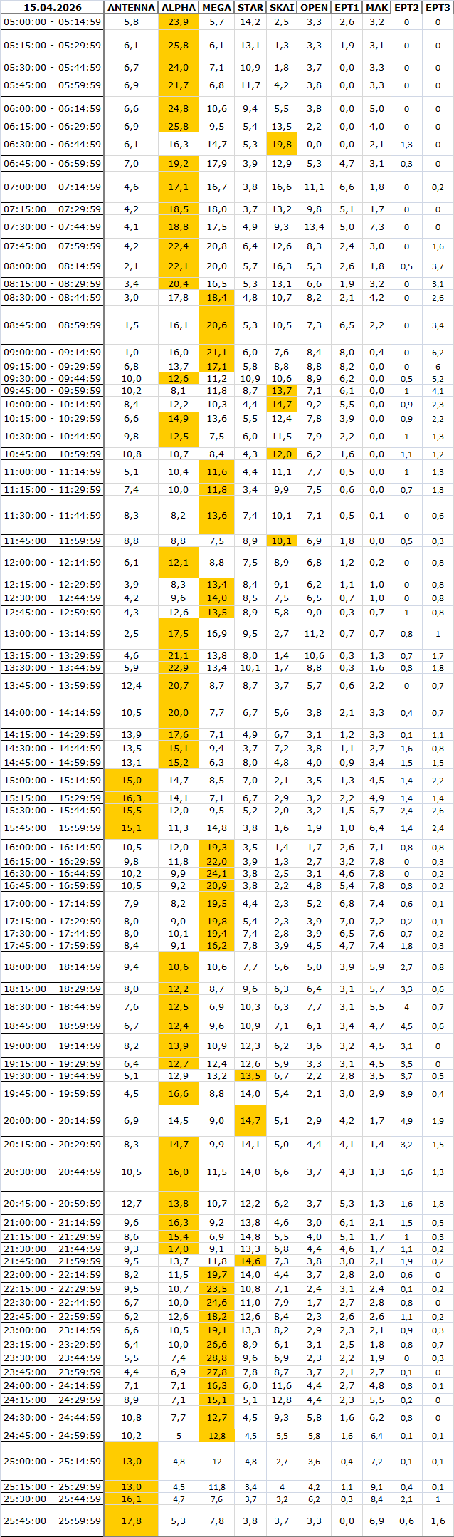 Δείτε αναλυτικά μέσα απο το TVNEA.COM τα 15' στο δυναμικό κοινό αλλα και το σύνολο ημέρα και prime time.