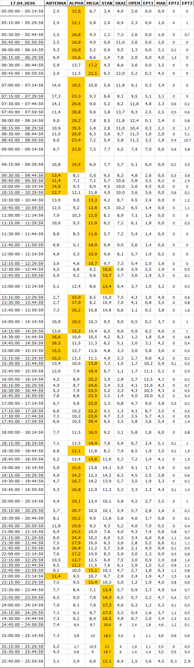 Δείτε αναλυτικά μέσα απο το TVNEA.COM τα 15' στο δυναμικό κοινό αλλα και το σύνολο ημέρα και prime time.