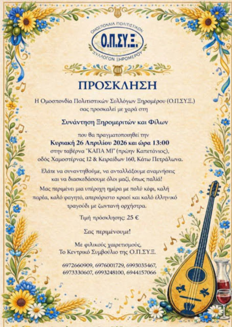 Συνάντηση Ξηρομεριτών και φίλων της Ομοσπονδίας Πολιτιστικών Συλλόγων Ξηρομέρου ( Ο.Π.ΣΥ.Ξ.) την Κυριακή 26 Απριλίου 2026 και ώρα 13:00. ximeronews