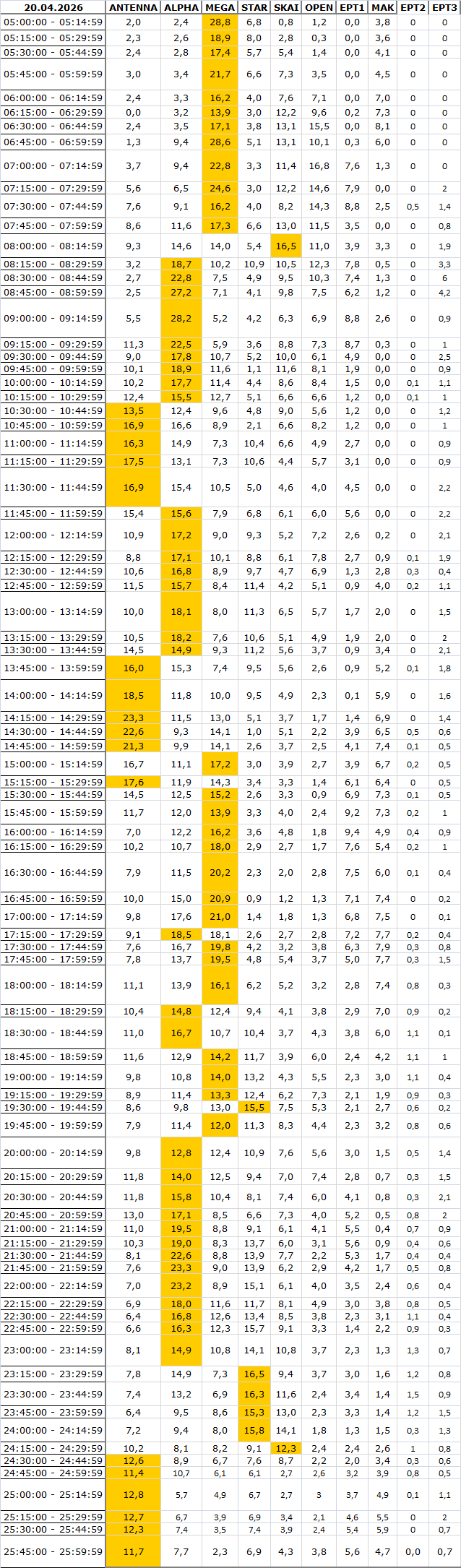 Δείτε αναλυτικά μέσα απο το TVNEA.COM τα 15' στο δυναμικό κοινό αλλα και το σύνολο ημέρα και prime time.