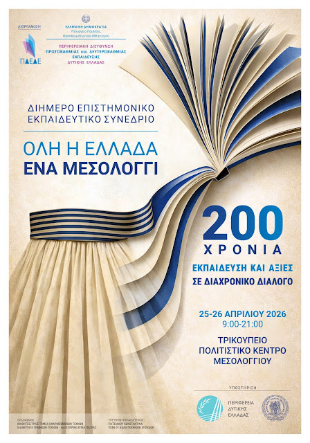 Σας προσκαλούμε στο διήμερο επιστημονικό και εκπαιδευτικό συνέδριο με τίτλο: "Όλη η Ελλάδα ένα Μεσολόγγι: 200 χρόνια Εκπαίδευση και Αξίες σε Διαχρονικό Διάλογο", που διοργανώνεται από την Περιφερειακή Διεύθυνση Πρωτοβάθμιας και Δευτεροβάθμιας Εκπαίδευσης Δυτικής Ελλάδας με την υποστήριξη της Περιφέρειας Δυτικής Ελλάδας και του Δήμου Ι.Π. Μεσολογγίου, και το οποίο θα υλοποιηθεί το Σάββατο 25 Απριλίου έως και την Κυριακή 26 Απριλίου 2026 και ώρα 09:00 έως και 21:00 στο Τρικούπειο Πολιτιστικό Κέντρο Μεσολογγίου....Διαβάστε Περισσότερα... ximeronews
